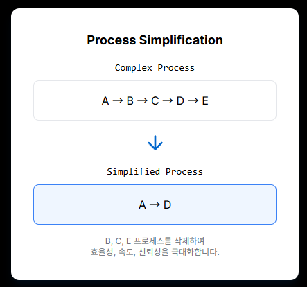 - 단순화하고 정리하라. 이 단계는 불필요한 부분을 삭제한 후에만 옵니다. 흔한 실수는 존재해서는 안 될 프로세스를 최적화하는 것입니다.