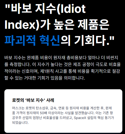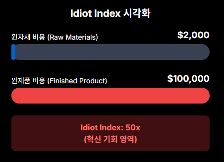 - 바보 지수(Idiot Index)는 혁신을 위한 강력한 사고 모델입니다. 완성된 제품의 비용과 원자재 비용 간의 비율을 측정하는데, 이 지수가 높다는 것은 비효율적인 제조 방식을 개선하여 시장을 파괴할 거대한 기회가 있음을 의미합니다.