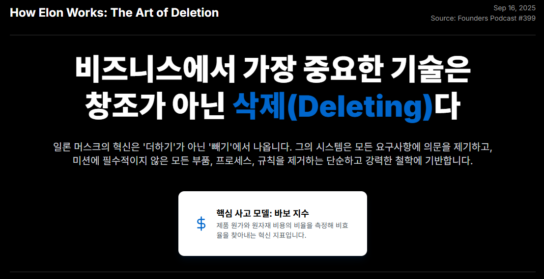 Founders 팟캐스트의 호스트 데이비드 센라(David Senra)는 월터 아이작슨(Walter Isaacson)이 쓴 일론 머스크의 전기를 60시간 이상 해체 분석하여, 머스크가 혁신적인 기업들을 세우는 데 사용한 정확한 프레임워크를 분리해냈습니다. 센라는 비용 절감을 위한 '바보 지수(Idiot Index)'부터 5단계 문제 해결 알고리즘에 이르기까지, 머스크의 반복 가능한 시스템을 설명합니다. 그 핵심 철학은 놀랍도록 단순합니다. 진정한 발전은 모든 요구사항에 끊임없이 의문을 제기하고, 미션에 절대적으로 필요하지 않은 모든 부품, 프로세스, 규칙을 무자비하게 삭제함으로써 이루어진다는 것입니다.