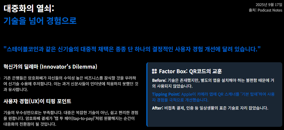 - 사용자 경험이 티핑 포인트: 스테이블코인(stablecoins)과 같은 신기술의 대중적 채택은 종종 단 하나의 사용자 경험 개선에 달려 있습니다. 애플의 네이티브 QR 스캐너가 QR 코드를 대중화했듯이, 원활한 '탭 투 페이(tap-to-pay)' 기능이 암호화폐 결제의 전환점이 될 수 있습니다.