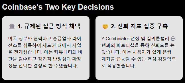 - 역발상적 규제 수용: 코인베이스는 초창기 암호화폐 경쟁에서 역발상적인 규제 수용 접근법으로 승리했습니다. 경쟁사들이 무정부주의적 정신을 받아들일 때, 코인베이스는 라이선스와 은행 파트너십을 확보하여 신뢰를 쌓았고, 이는 핵심적인 경쟁 우위가 되었습니다.