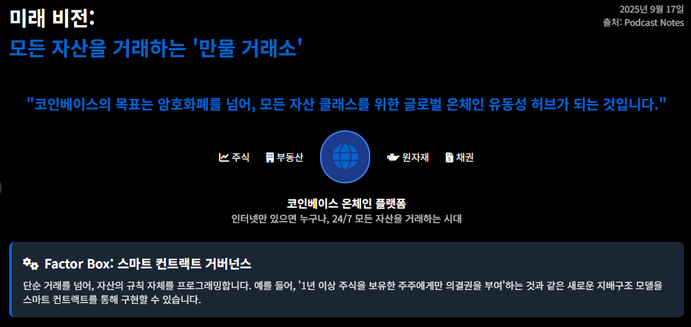 - 모든 자산의 거래소: 미래 금융의 모습은 주식, 부동산, 원자재 등 모든 자산 클래스가 토큰화(tokenized)되어 인터넷만 있으면 누구나 24시간 연중무휴 온체인(on-chain)에서 거래할 수 있는 '만물 거래소(everything exchange)'가 될 수 있습니다.