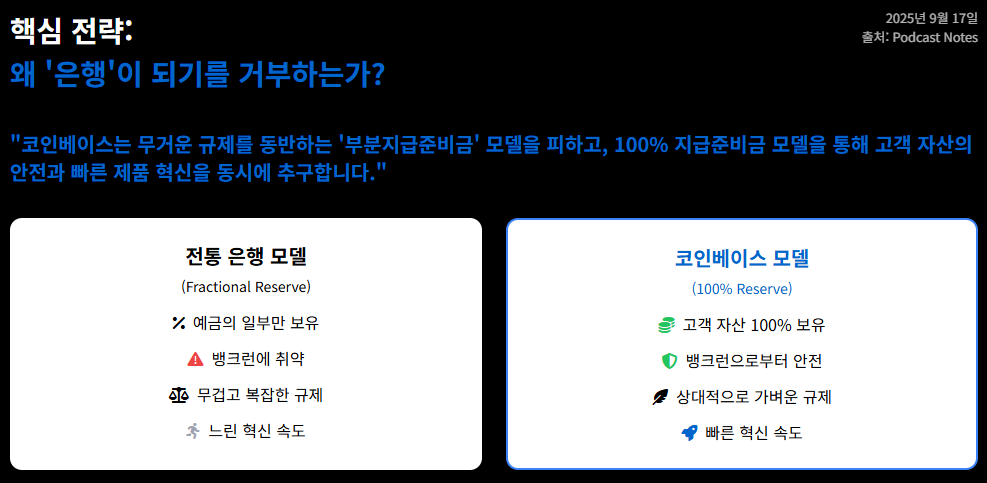 - 은행이 되지 않으려는 전략: 코인베이스는 의도적으로 은행 라이선스 취득을 피합니다. 이는 부분지급준비금(fractional reserve lending) 제도를 따라야 하기 때문입니다. 100% 지급준비금 모델은 고객에게 더 안전하며, 무거운 규제 부담 없이 더 빠른 혁신을 가능하게 합니다.