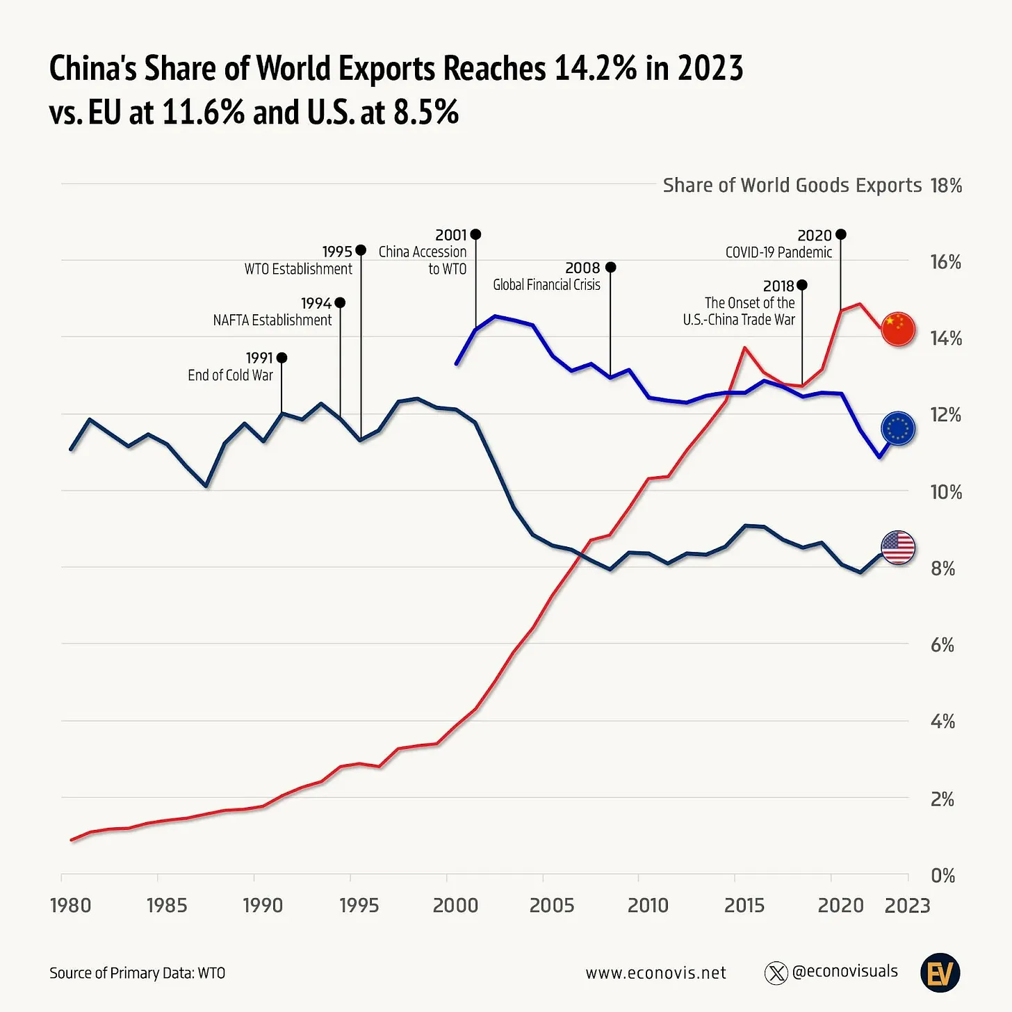 중국 경제의 핵심은 수출입니다. 중국은 세계 최대 수출국이며, 전 세계 교역량의 14%를 차지합니다. 제조업은 단순한 자부심이 아니라 경제의 생명줄입니다.