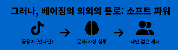 - 소프트 파워라는 장기적 무기: 중국은 군사적 침공이라는 막대한 리스크 대신, 동일 언어(만다린)를 활용한 문화 콘텐츠 침투와 경제적 통합을 통해 대만 젊은 세대의 마음을 얻는 장기적인 소프트 파워 전략을 구사하고 있습니다.