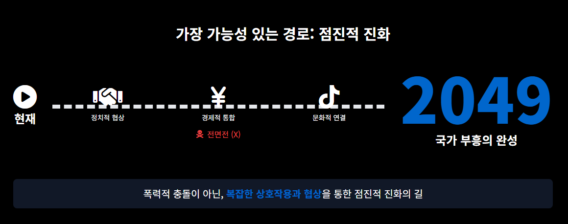 중국 공산당에게 '대만 문제'는 국가 부흥 서사의 마지막 장을 완성하는 것입니다. 2049년 중화인민공화국 수립 100주년은 통일을 위한 상징적인 목표 시점입니다. 이러한 확고한 의지를 고려할 때, 베이징은 결국 자신들이 수용할 수 있는 결과를 얻어낼 가능성이 높습니다. 그러나 그 방식은 전면전이 아닐 것입니다.