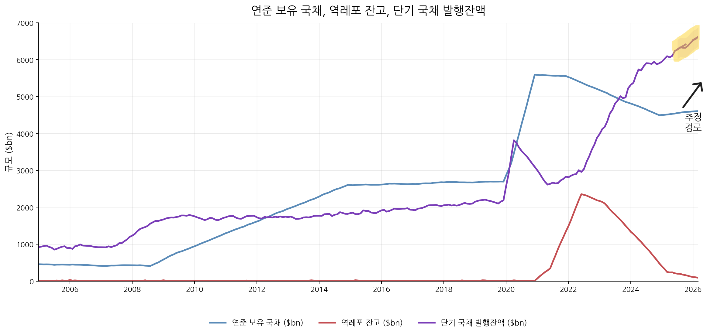 먼저 연준을 살펴보자, 연준은 24년 QT속도를 늦췄고, 이후에는 QT를 종료하고 만기도래 국채를 롤오버하는 방식으로 전환했다. 또 MBS 상환분을 단기국채로 재투자하는 운영을 명확히 했다.