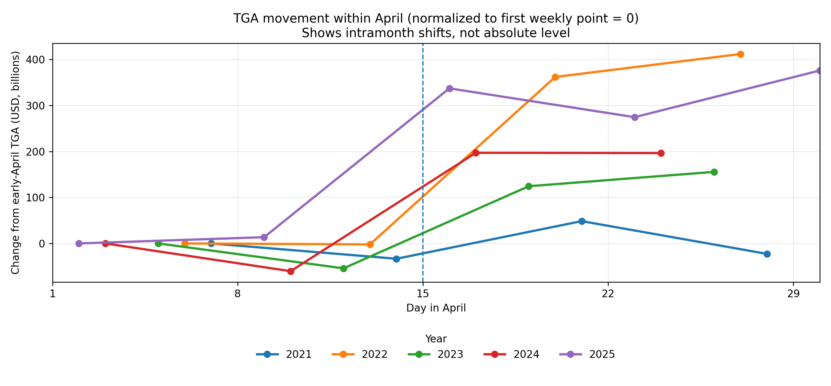 실적 시즌이라서? 금리 이벤트가 많아서? 물론 그것도 맞다. 필자는 4월을 볼 때, 먼저 달러 유동성의 계절성부터 본다. 특히 재무부의 현금이 어떻게 움직이는지가 중요하다.